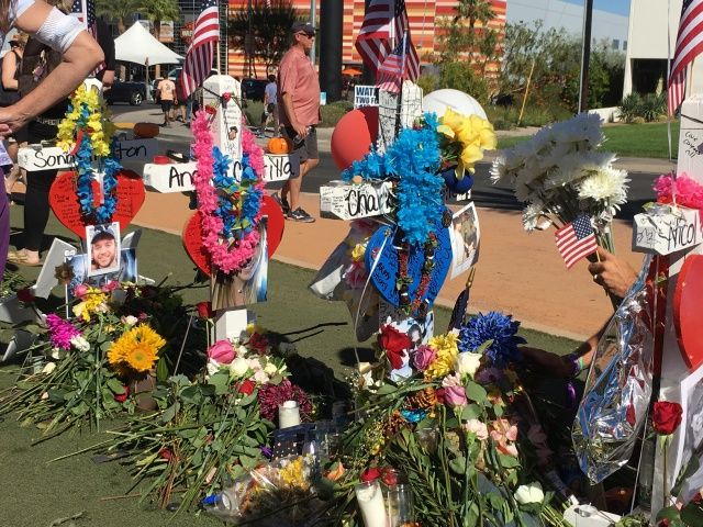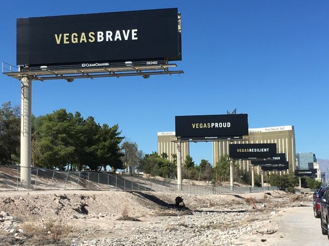 ラスベガスの有名なウェルカム看板です。自宅からわずか3マイルのところにあります。大勢の人々が乱射事件の被害者に花やメッセージを捧げていました。