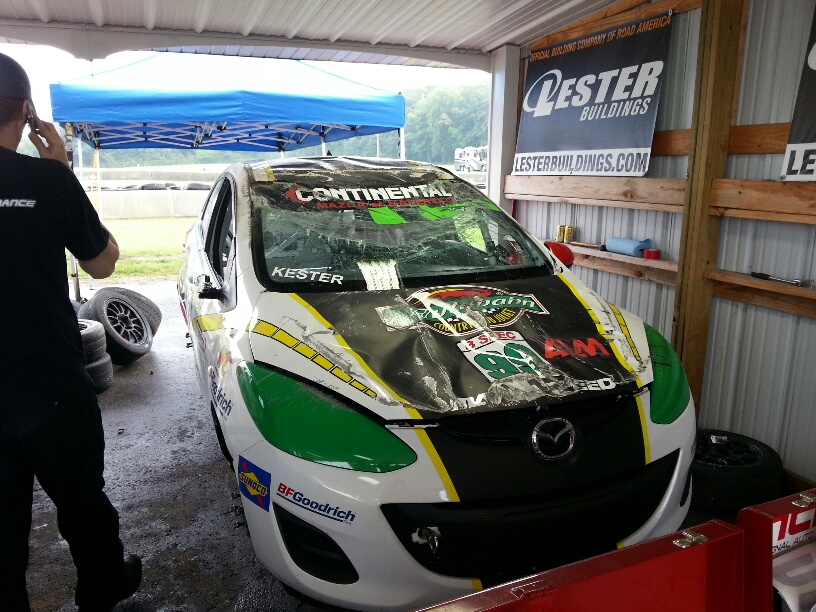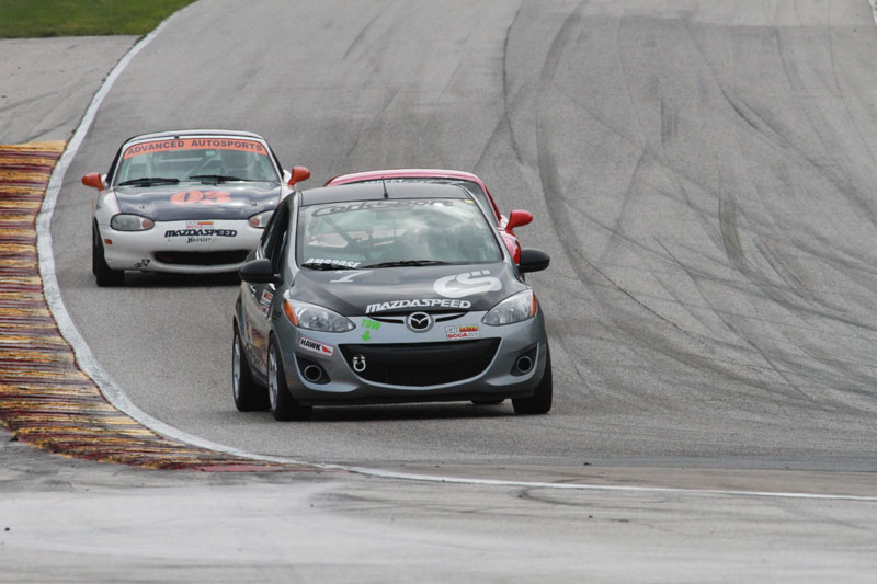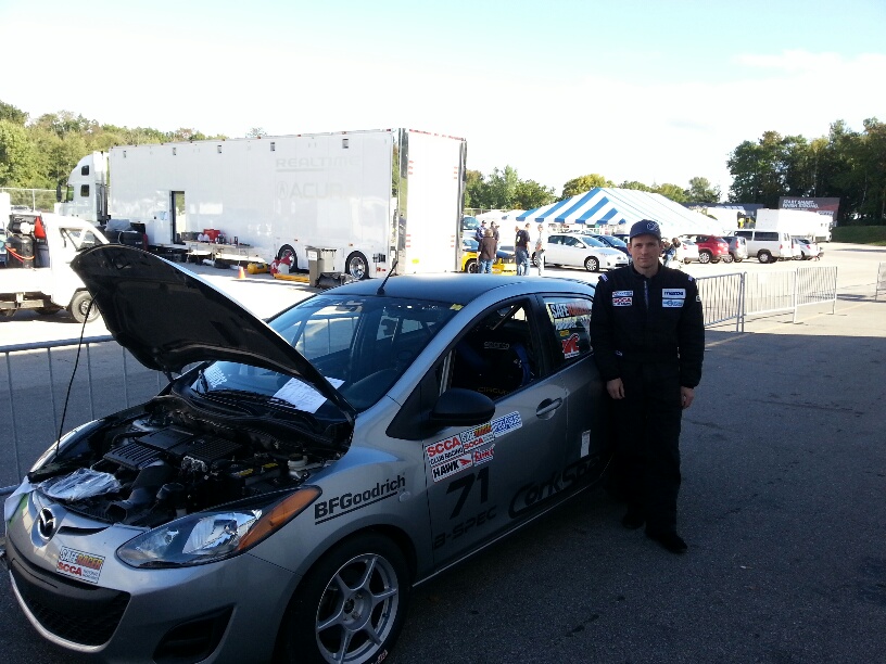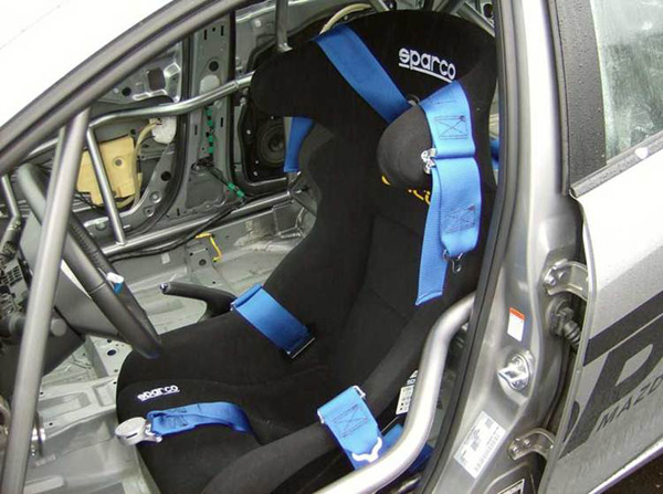 Mounting the harnesses takes some planning. After getting a good idea of where we were going to mount the seat we got to work on the mounting points for the harness. In the Mazda 2 there is only 1 factory bolt location that we could use for the lap belt. The other side of the factory seat belt mounts to the original seat. The rules require you to have a 4 inch square backing plate for the harness on the back side of the car body to make sure the anchor points for the bolts do not tear through if you are involved in a wreck. We had to do this in three locations on the 2, one for the lap belt on the tunnel side and the two for the sub belt. After planning the hole locations and making sure there was no interference (make sure when you are drilling hole into your car you look at the other side of the panel) parts on the bottom of the 2 which there was since the brake lines and fuel lines pass under the drivers seat, we got to work with drilling the holes and mounting the eyelets. The actual installation of the harnesses is easy, they simple snap onto the mounting eyes and feeding the harness around the cage bar behind the seat.