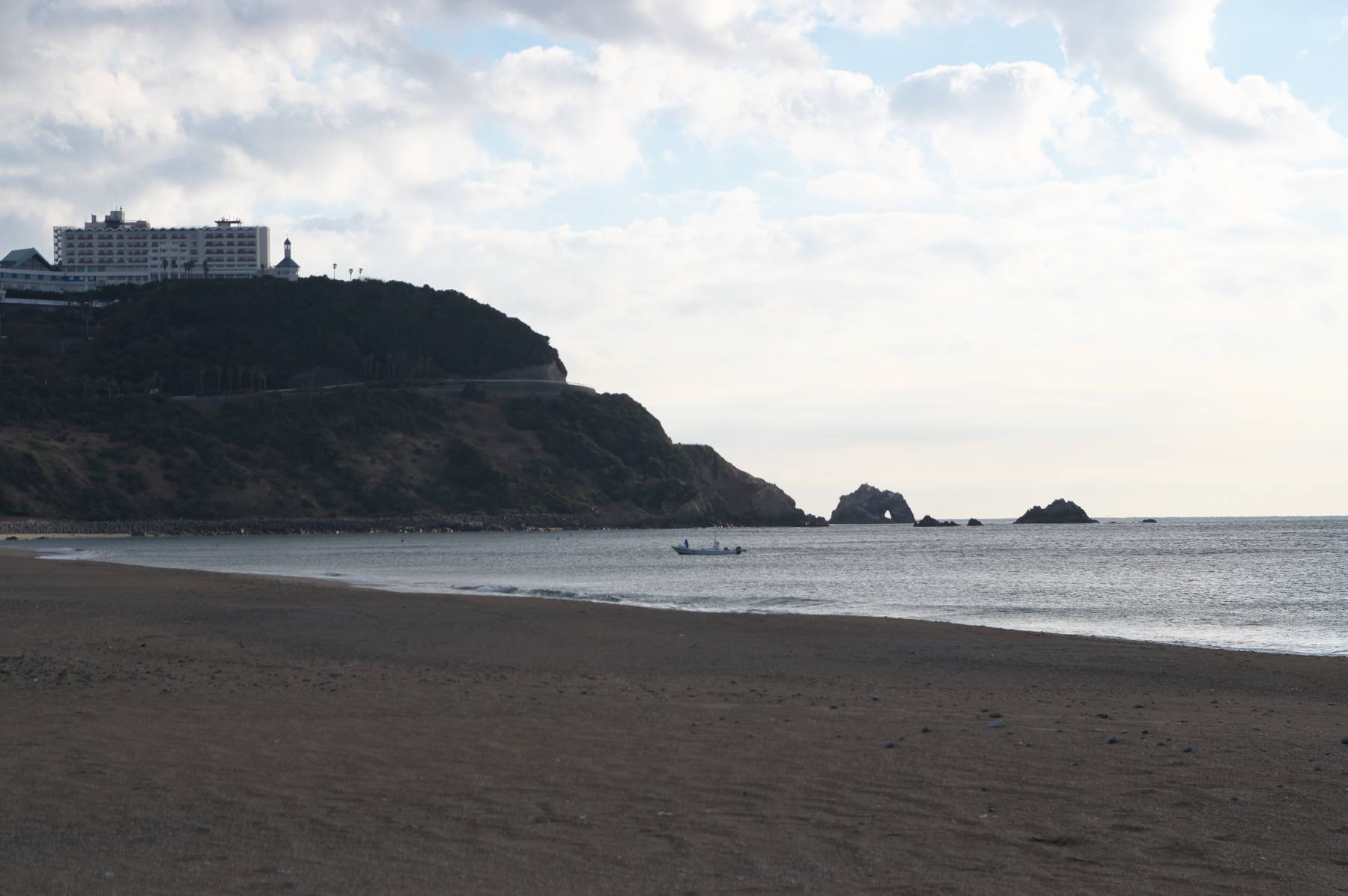 恋路ヶ浜の向こうには、早朝に朝陽を撮影した日出の石門が見えます(海上にある穴の空いている岩)。