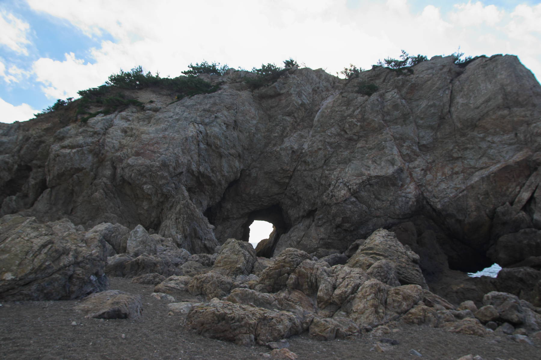 これを観るため、早朝の撮影場所だった高台を超えて再度海岸に降りて駐車場へ。そこから数100mあると岸の石門がありました。
