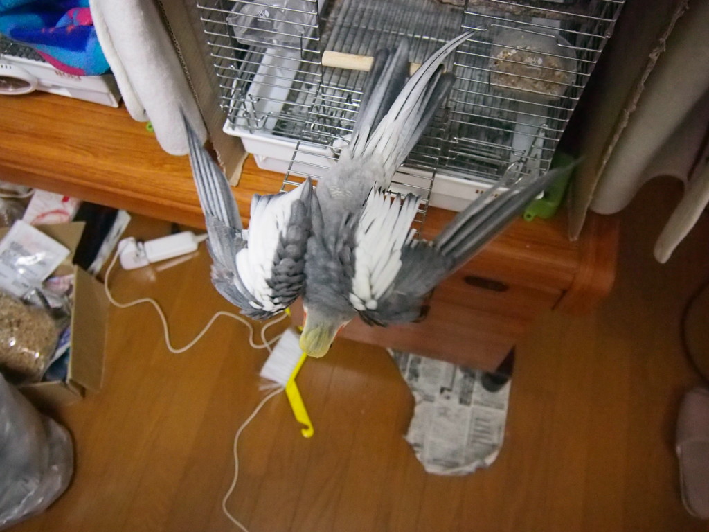 所々、羽が短いところがありますが、家にお迎えするときに、店でザックリ切られた羽です。