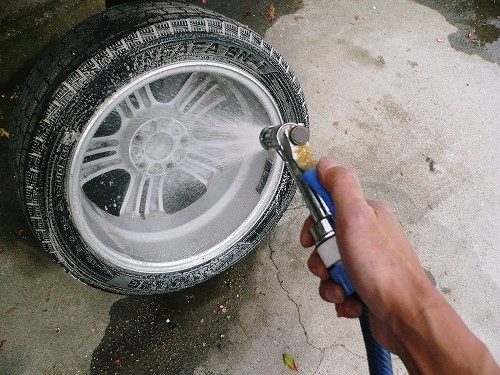 手際よく4本とも洗ったら、すぐに洗い流します。この時、ホイールハウス内も一緒にゴバーーーと洗います。
