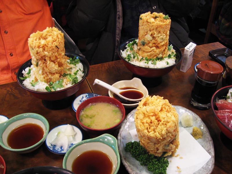 他の皆さんが食べたのは、海鮮かき揚げ丼(大盛り)。スゴイ高さです。テラ盛りファイターの皆さんは、量的には問題なかったみたいなのですが、同じ味が続くことに苦戦されたようで、最後は海鮮丼についてきた“わさび”の助けを借りながら、完食されました(^^)