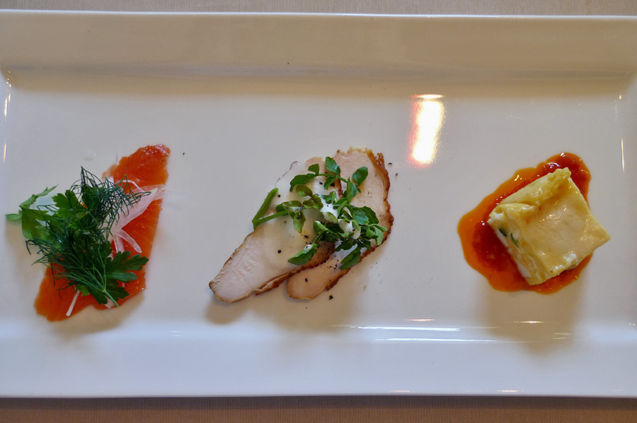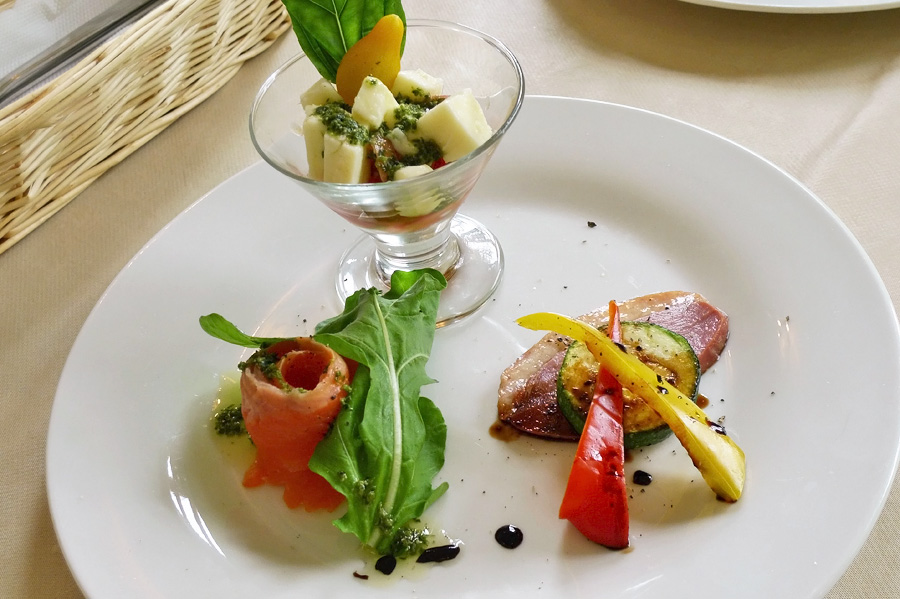 上中:前菜 (サーモンの?・チキンの?・玉子のグラタン)