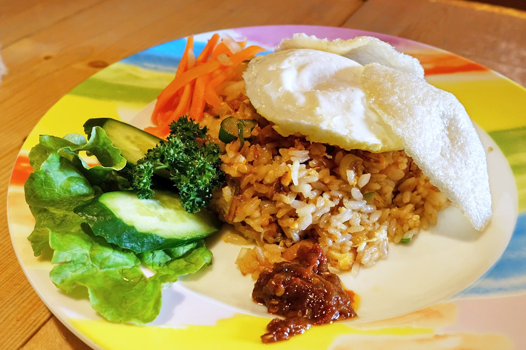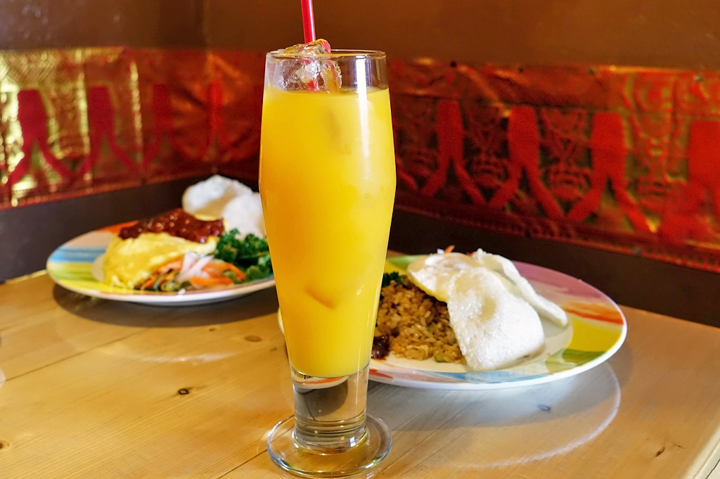 ↑これだけで他店なら¥500-は取られそうなくらい大きいグラスのマンゴージュース(;^_^A 余裕があれば噂の生アヴォカドジュースを頼もうと思ったのですが... という事で、このナシゴレンセットでなんと¥800-(税抜)でしたΣ( ̄口 ̄;)安っ