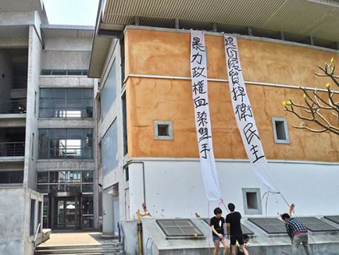 3月下旬、新竹県竹北市の国立交通大学客家文化学部校舎外壁に、