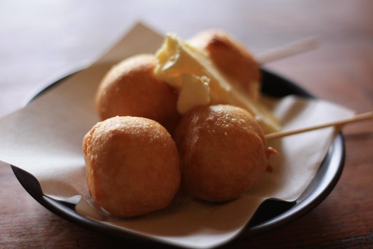 蒸かしたジャガイモをこねて丸めて揚げてあり、マーガリンがたっぷり付いています。