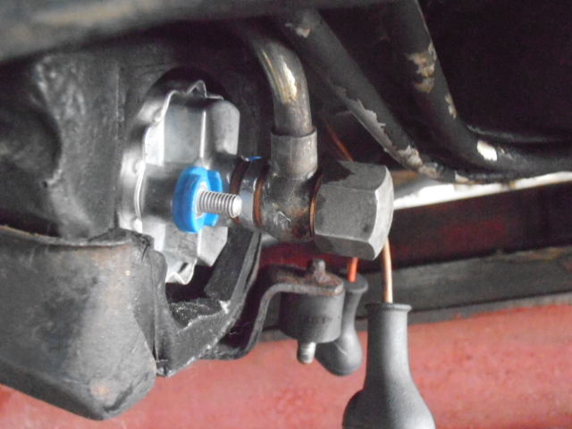 リフトにあげてみると・・・、バンジョー部の金属パーツとフューエルラインをかしめてある部分あたりから漏れているようだ・・・、要するに増し締めしすぎたのか?wいやいやもともとここから漏れていたのだろう・・・だからいくら増し締めしたって止まるはずもないw