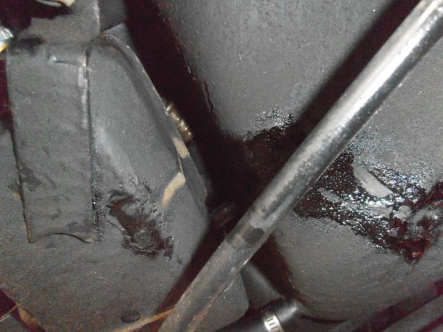 このバンジョー金属部のパイプが燃ポン上側からほぼ垂直に下方向へ向いているのが正解だろうが増し締めをしたことにより斜めに傾き元々漏れていたガソリンが燃料タンクの横を垂れてくるようになりタンク表面の素材を溶かしそれがタールのようになって垂れていたようである。