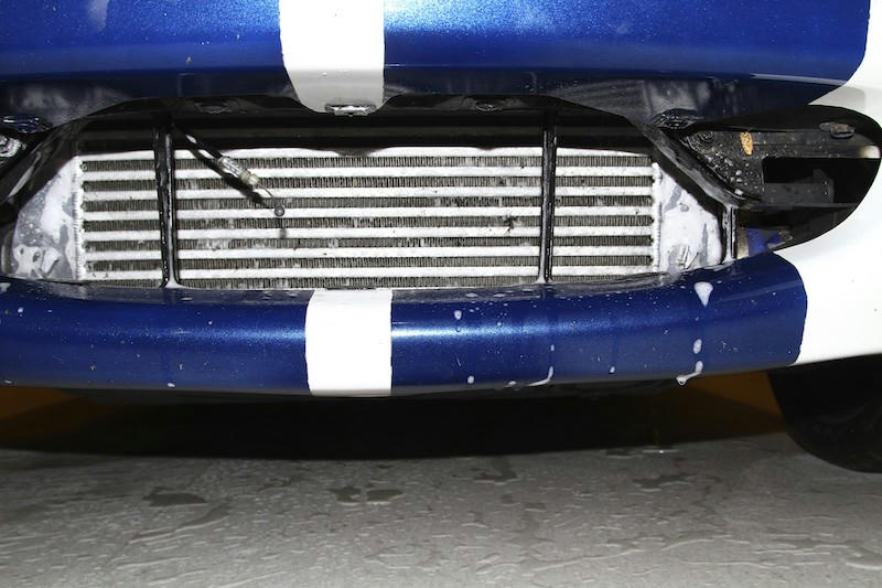 インタークーラーの虫も凄いので忘れずにやっときます、インセクトリムーバーをじゅぽじゅぽ拭きかけて間をおいてケルヒャー.簡単にスッキリキレイになります.このケミカルはしっかりすすぐ事.ぶら下がっているのオープナーのワイヤ、「ボンネット」と言う言葉は英国式表現なので個人的にあえて使わないようにしています.趣味の世界ですから.「サイドブレーキ」も「Eブレーキ」がヤンキー式.
