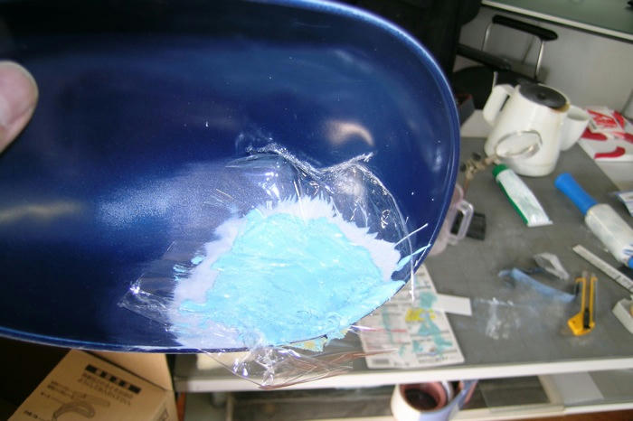 ポリパテ硬化後の表面のネバネバが大嫌いなのでラップを被せます.