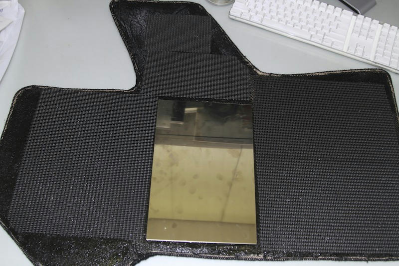これまでのマットではヒールポイントに塩ビ板の1.5tを使用していましたが、長期の使用で割れる事が分かり違う素材を考えていました.最終的にステンレス板の0.8tを使う事にしました.多少の変形はあるかも知れませんが塩ビに比べるとはるかに強度があります.