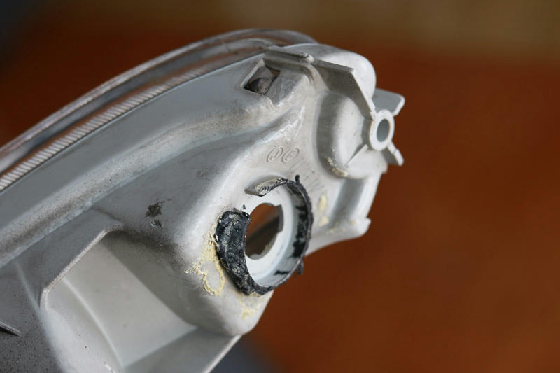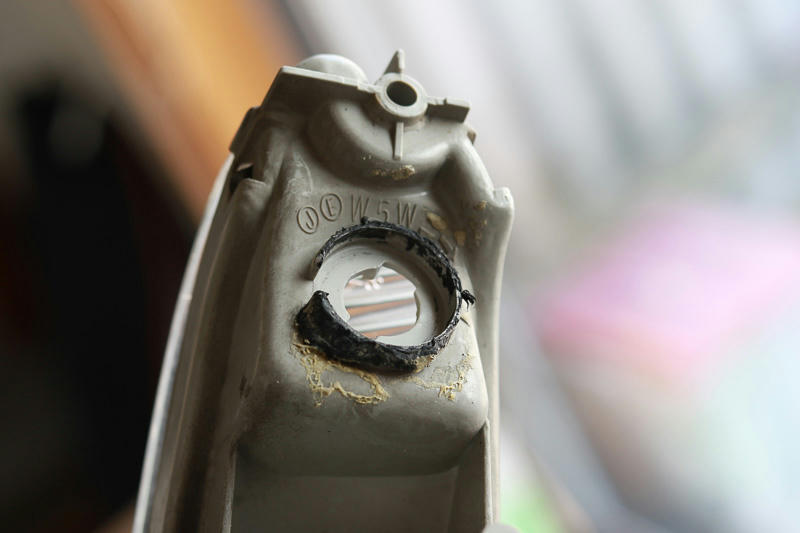 溶けたソケットが接着されていた部分、前にアルミテープで補修したところ.