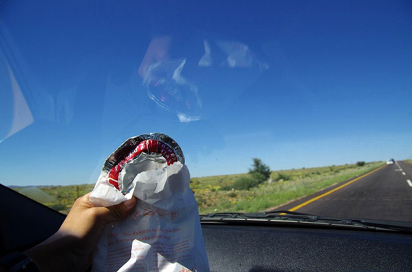 車に戻ってハンバーガーをパクついたら、ドレッシングが思いっきりズボンにこぼれました。