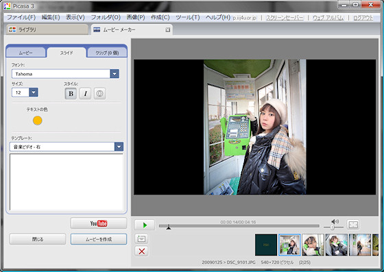 あまり凝った演出は出来ない反面、非常に簡単な操作でムービーが作れます。Picasaに登録された写真を選んで、BGMを選ぶだけ。必要に応じてテロップを入れたら、あとは「ムービー作成」ボタンをポチっ♪とするだけ。少し待つとムービーファイルが生成されます。