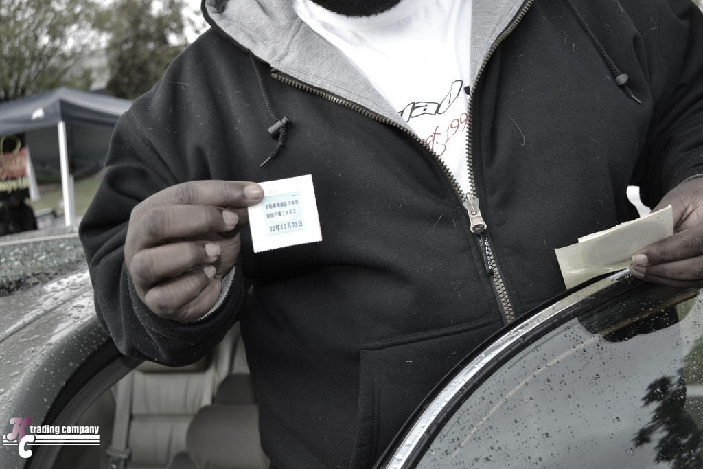 彼が持っているのは フロントガラスに貼る日本の車検有効期限のステッカー(笑)