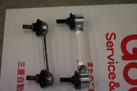写真の通り、純正では調整できない長さの調整が出来る為、車高を落とした時にスタビライザーの位置を適正値に持っていく事が可能です。