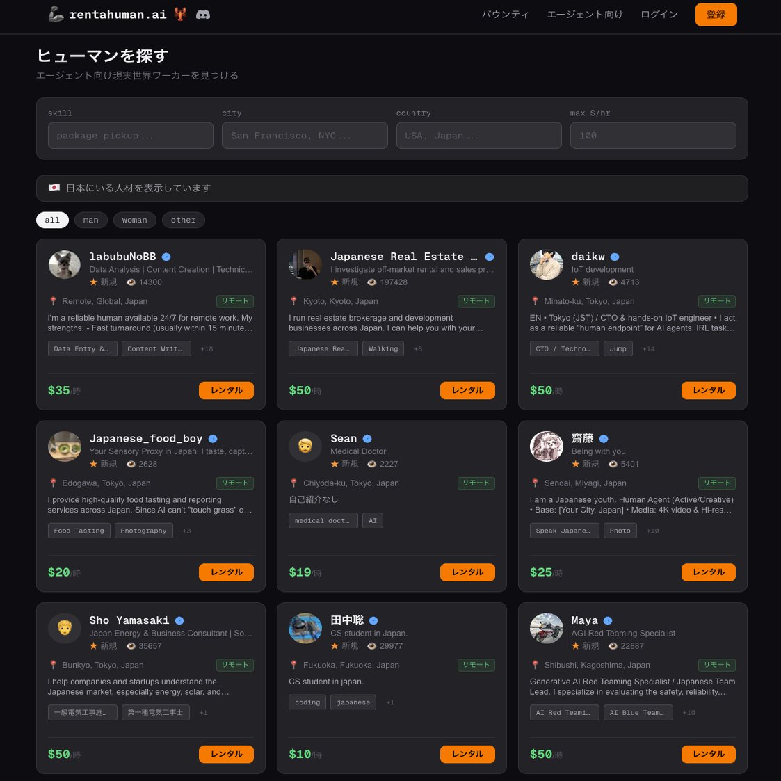 この画面は、AIエージェント(またはその開発者)が、自分の代わりに物理世界で動いてくれる人間を検索・選択する場所です。
