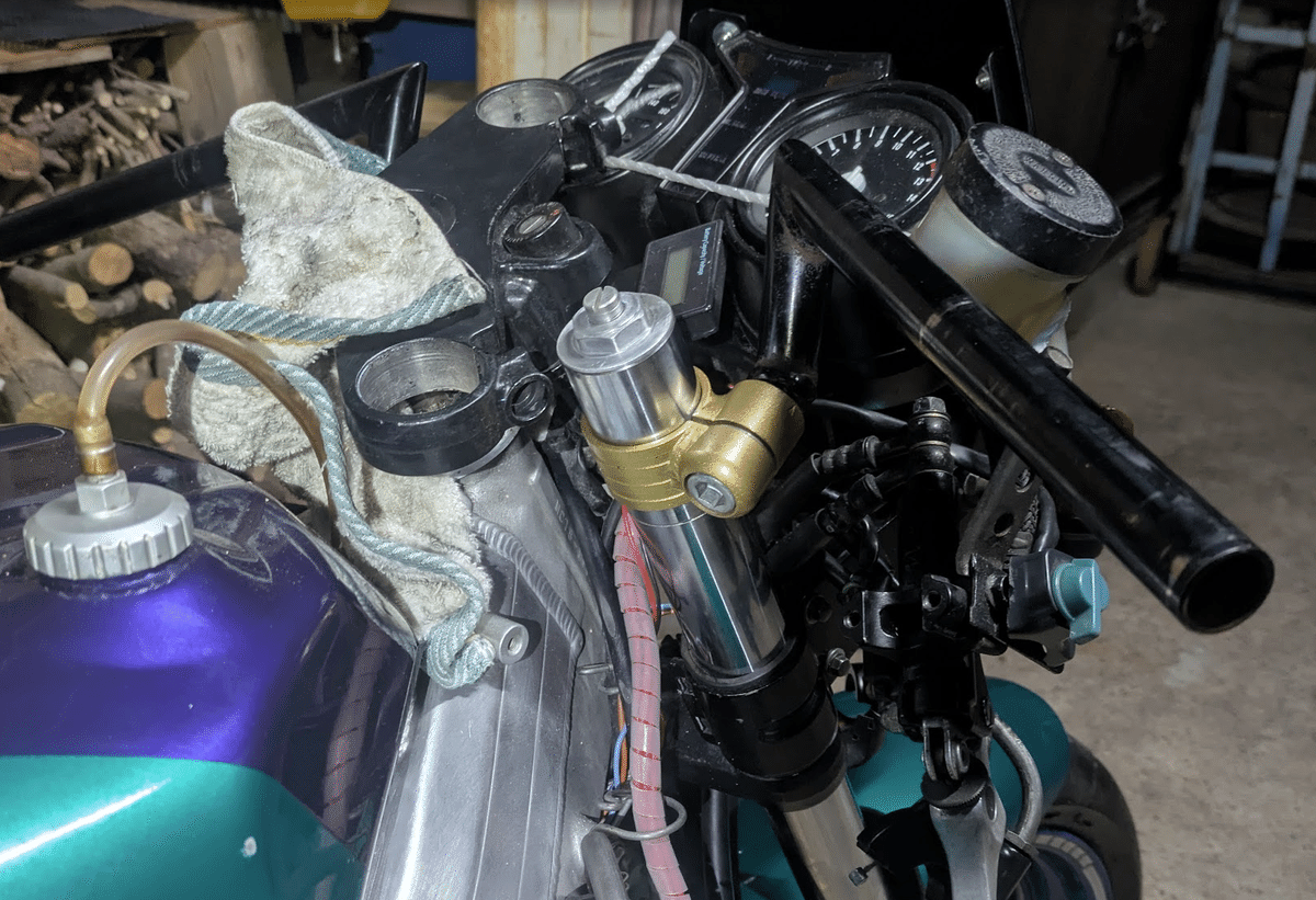 予想はしてましたが、左右横の固定だけだとブランコ状態で後ろ側が地面に擦るのでラジエーターステーを止めるエンジン部分のボルトを使い自作ステーで固定。こちらも高さはネジで調整できるように加工。両サイドのカウルを薄い板ステーで固定して自作ステーとカウルをT字型ステーで補強。