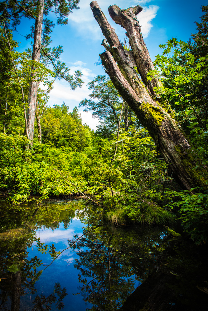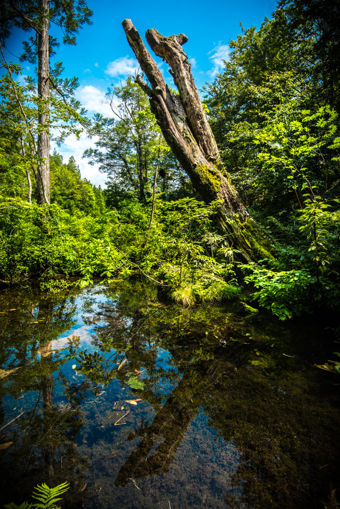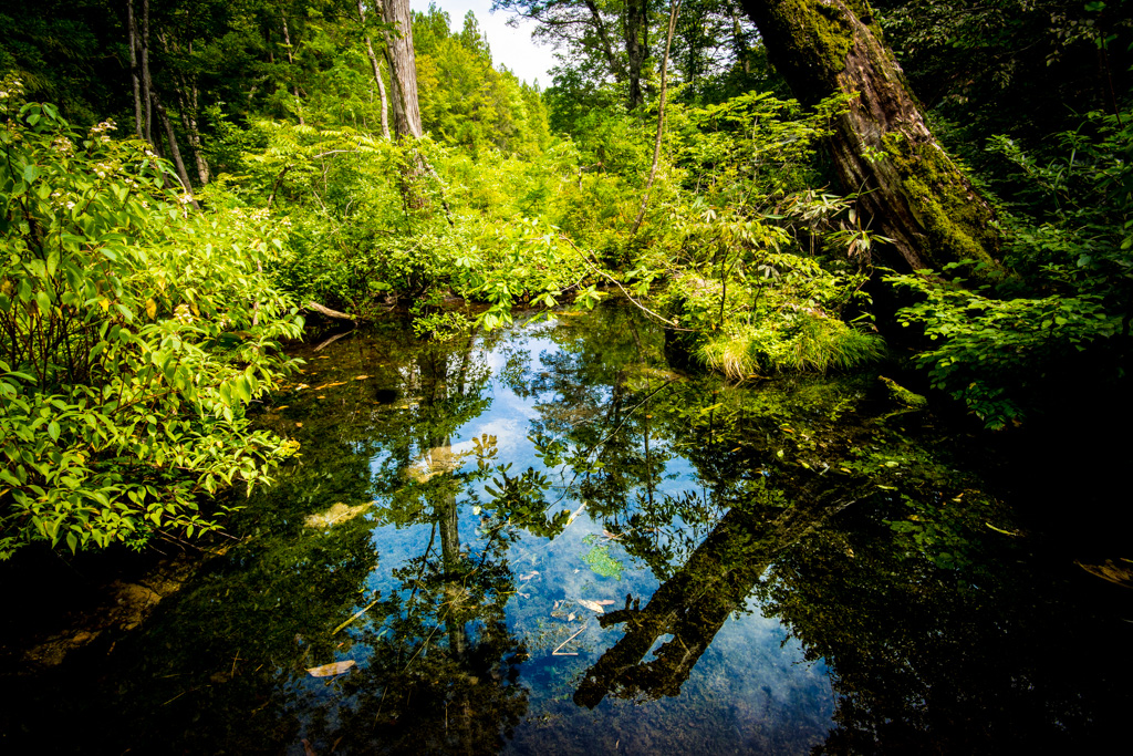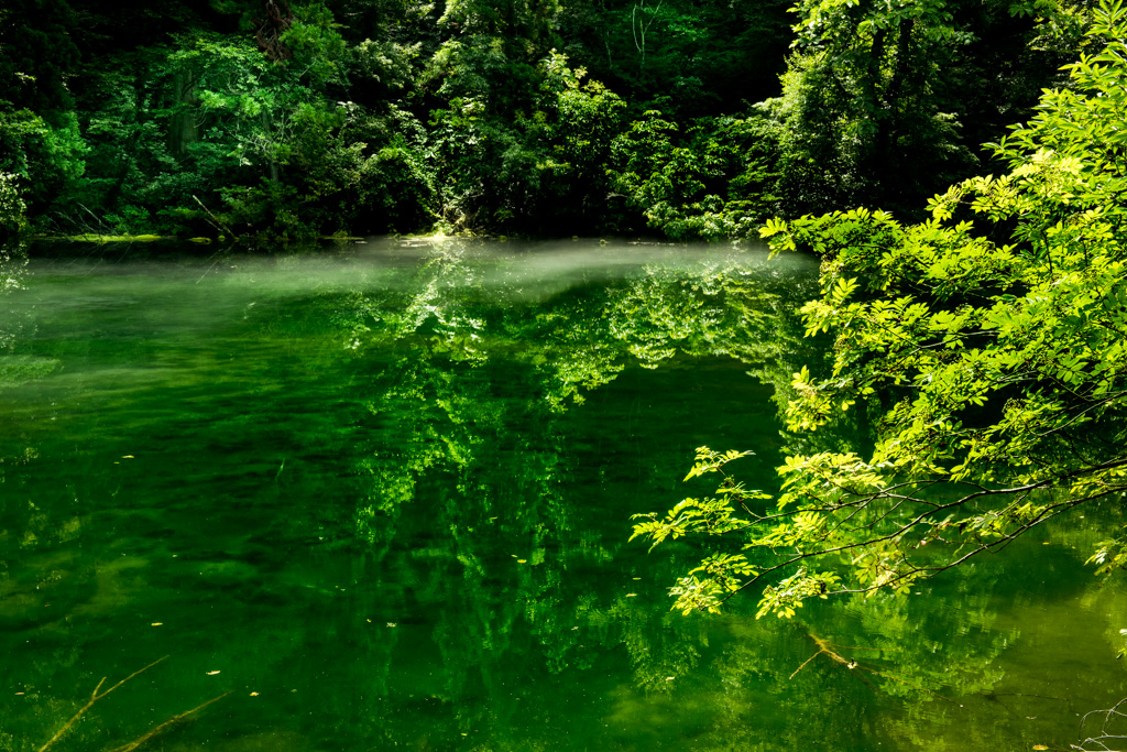 龍ヶ窪は樹木に覆われた沼で昼だというのに水面には靄が立ち込め、風で流され、また靄が出来てまた風で流されると言った神秘的な場所です。