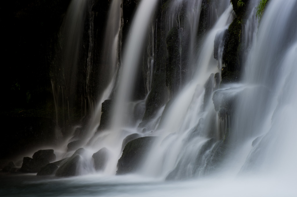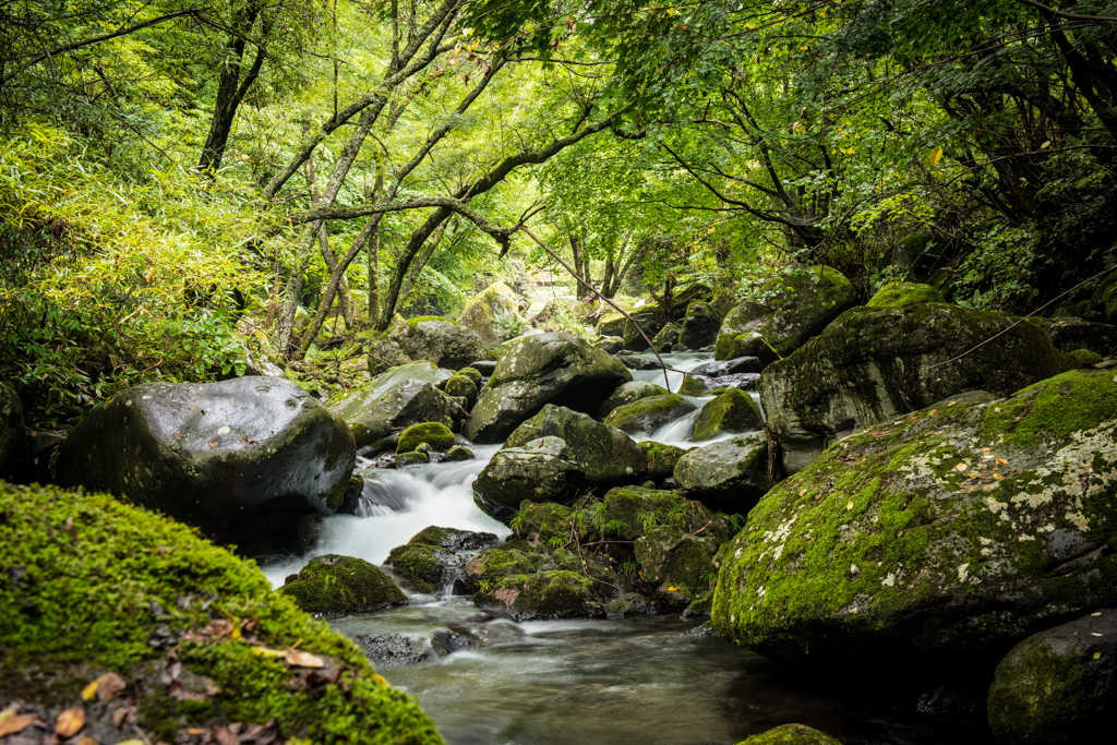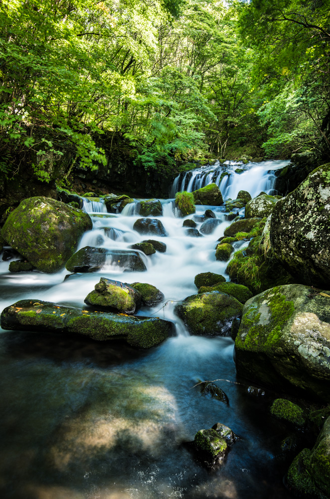 苔むした岩が転がる川原と蓼科大滝。