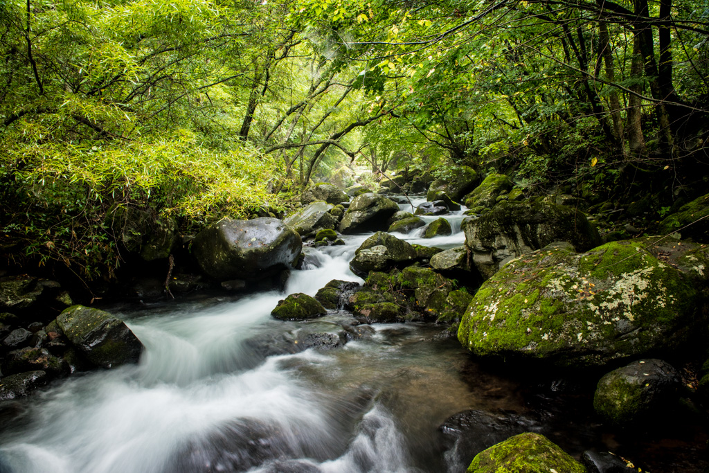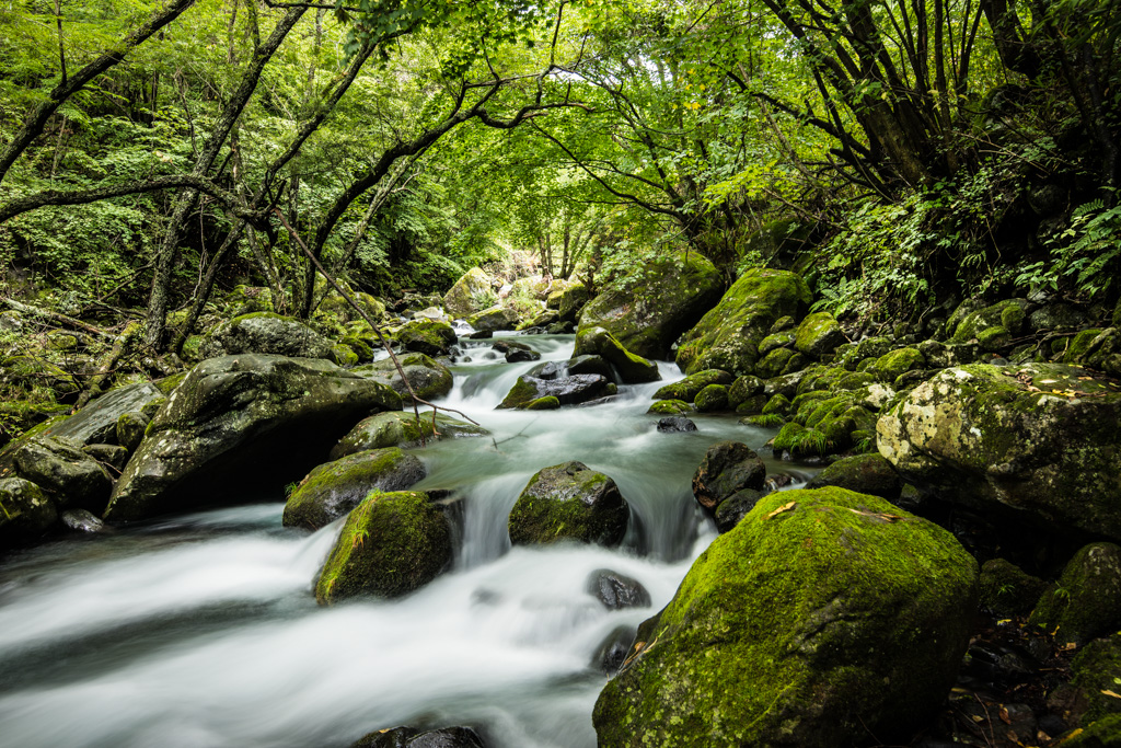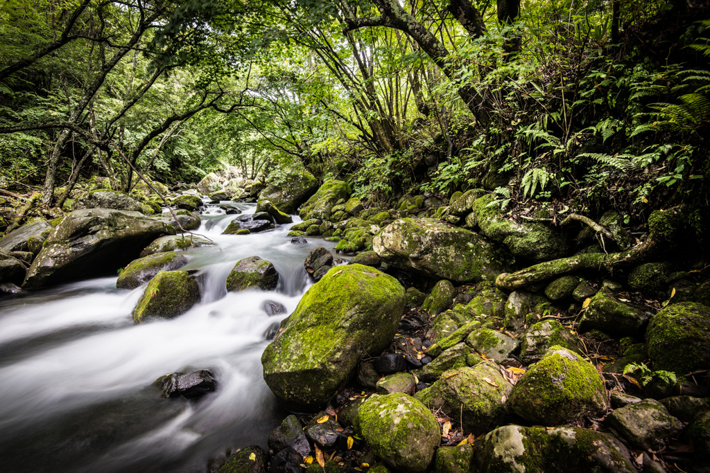 川沿いの苔むした原生林。