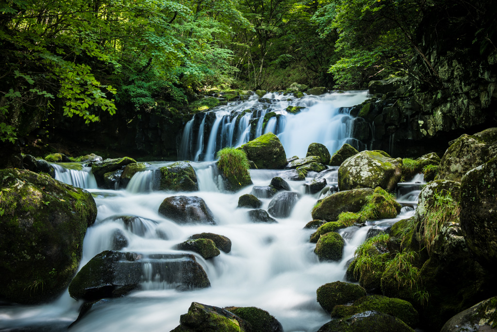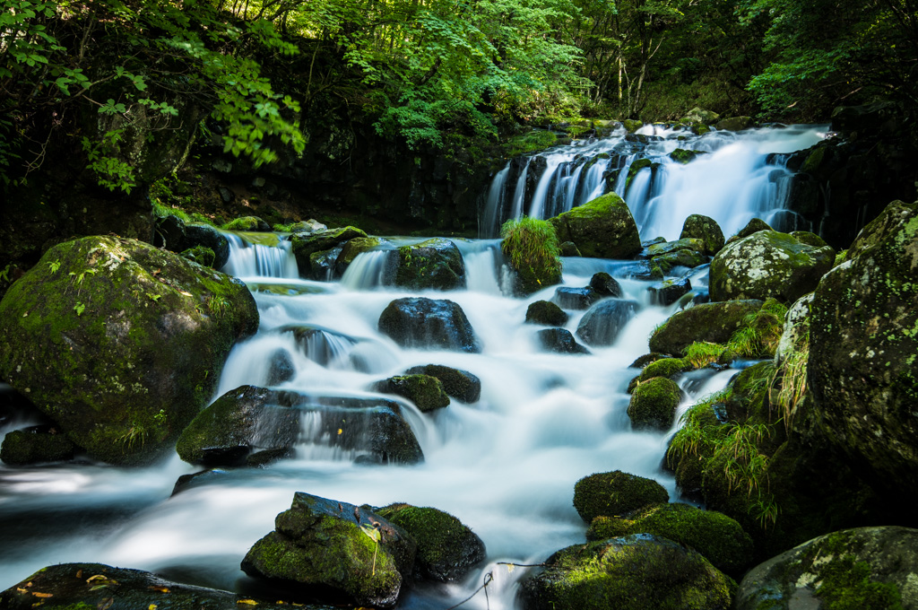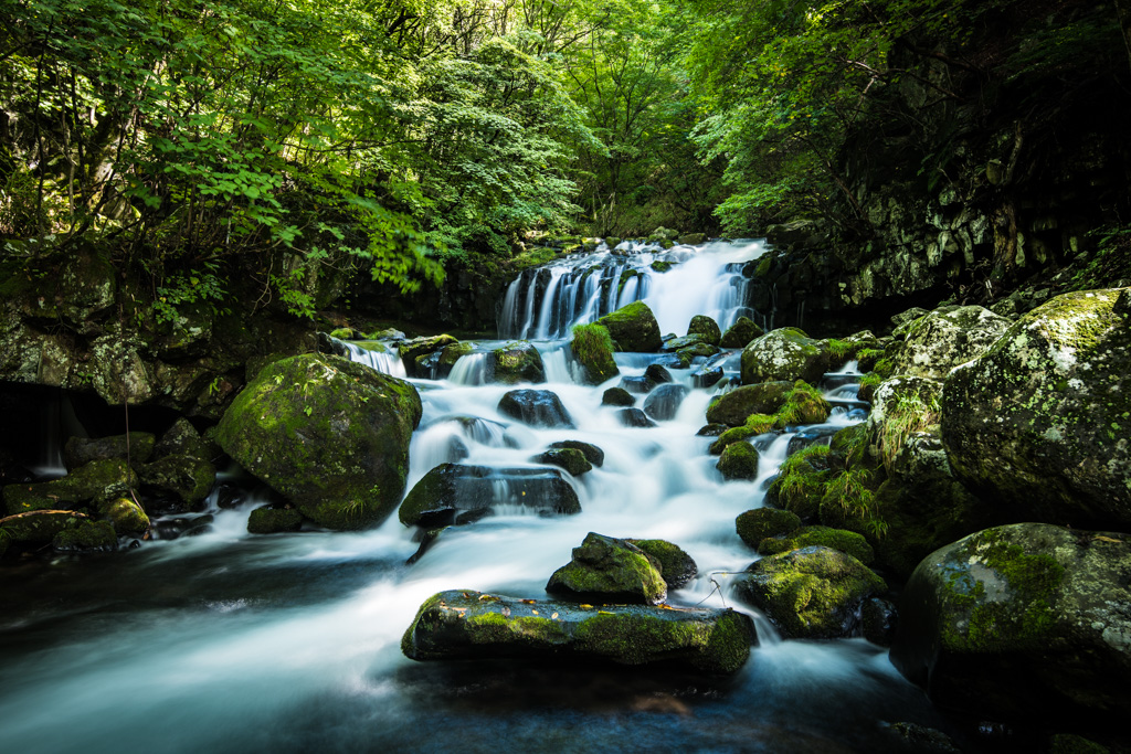 蓼科大滝と苔むした岩が散在する川原。