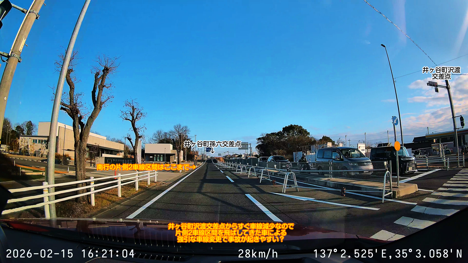 南へ向かう場合は井ヶ谷町沢渡交差点を過ぎてすぐに車線減少になり、