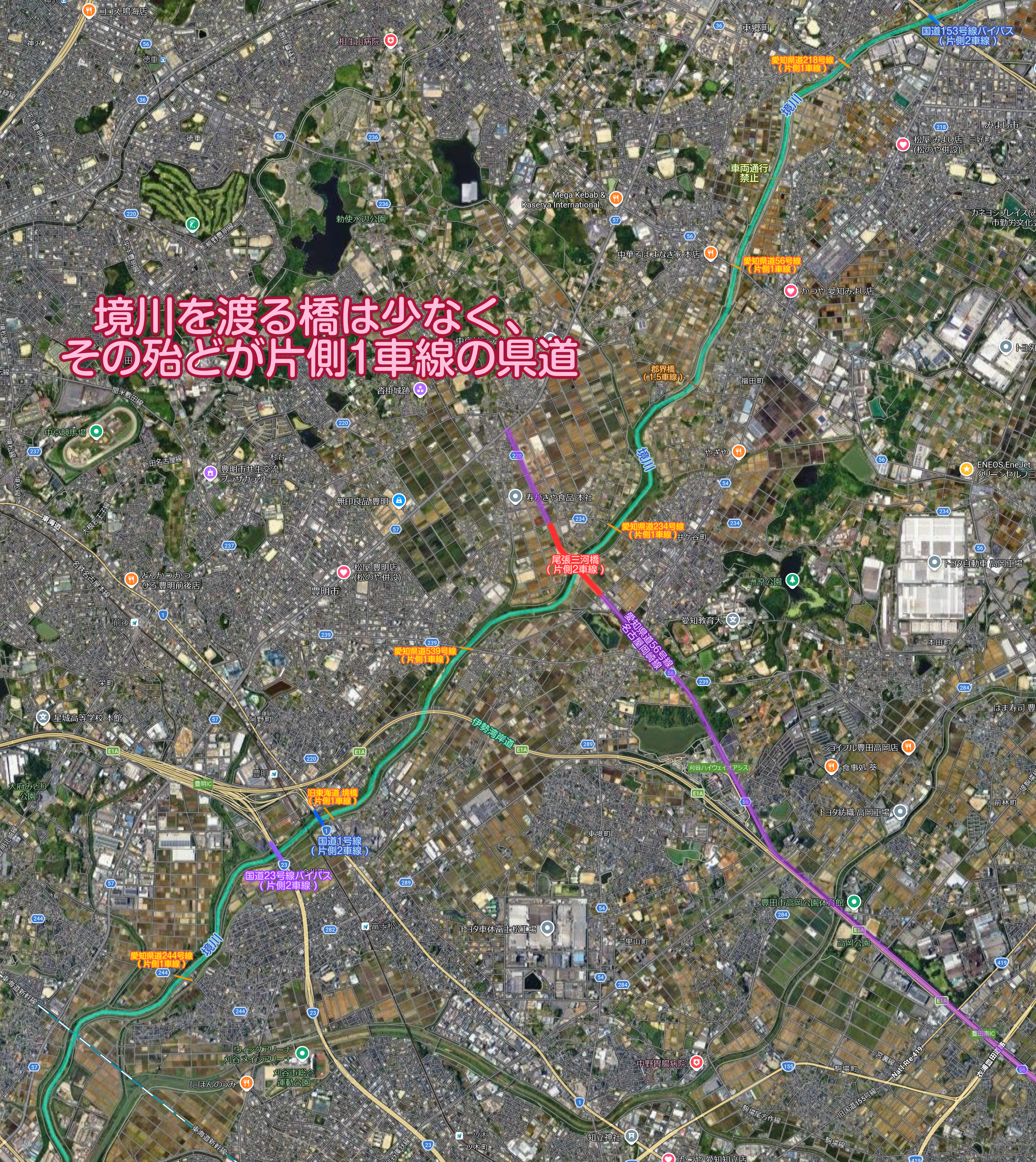 特に刈谷市と豊明市の間は橋が少ない地域になっていて、