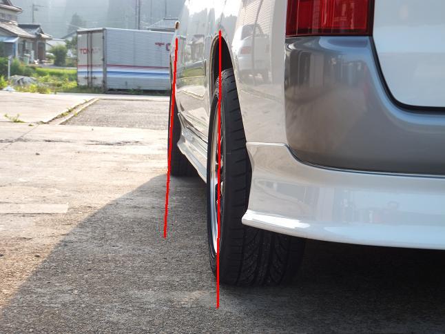 純正タイヤの時点で4輪アライメントを調整しているため、フロントのネガティブキャンバーが目立ちます。