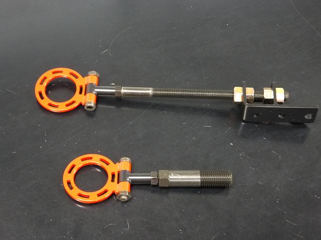 フロントは純正のけん引フック取り付け部分に画像の短いタイプをそのまま装着出来ますが、リヤは左側マフラーを付けていないので、そのバンパーの逃げ部分を通るように画像の長いタイプを装着します。