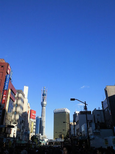 仲見世通りからもアーケードの隙間から東京スカイツリー
