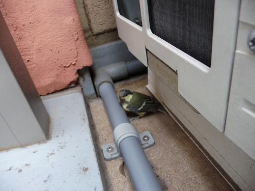 様子を見ていたら、なんとかベランダの隙間からは脱出したものの、今度はエアコンの室外機の下へ逃げ込む鳥ちゃん....orz