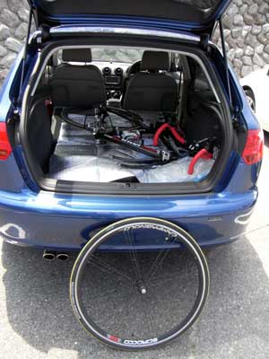 A3にはロードレーサーをどうにか積み込めますが、今日は無理せず前輪だけを外しています。
