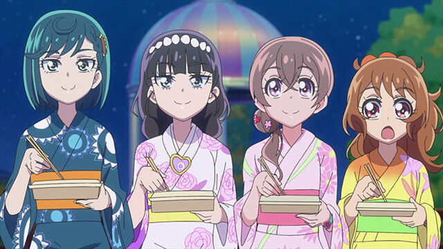レシピッピたちを助け出し、再開した屋台メシグランプリは、ゆいたちと藤野さんたちが同率で優勝となります。大会を終えたゆいたちは、「花火をいっしょに見ながら同じものを食べたら、ずっといっしょにいられる」というおまつりのジンクスを思い出しながら、夜空に打ち上がる花火をみんなで眺めるのでした。