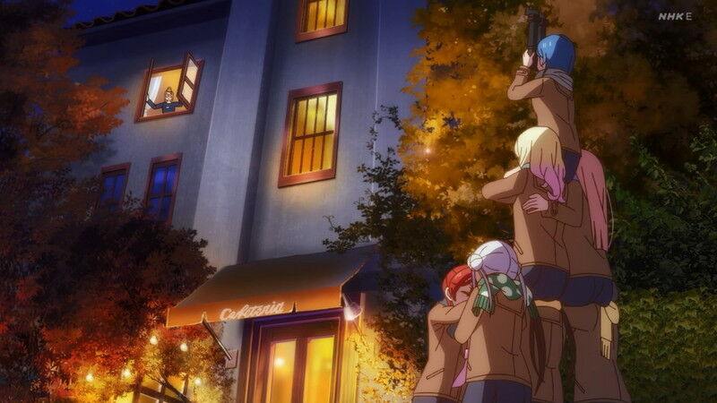 すみれの実家の神社で、いい歌が歌えますように!と願掛けする9人。