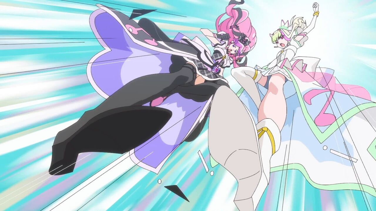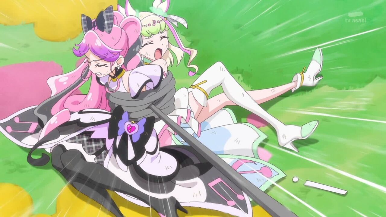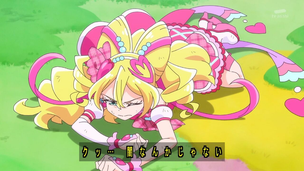 そんな中、ふたりの前にジョギがあらわれ、カイトの闇からダークランダーを出現させます。駆けつけたみんなと変身して立ち向かうアイドルの問いかけに「カズマと呼ばれているときもあった」と答え、カイトとの絆はとっくに切れている、と言い放つジョギ。それを聞いたアイドルは「私はカイトさんとの絆は絶対に離さない」とダークランダーに立ち向かいます。するとその気持ちこたえるかのように、アイドルハートリボンが出現し、新たなスタイルから放たれた「プリキュア!アイドルスマイリング・エコー!」によってダークランダーをキラキラにします。